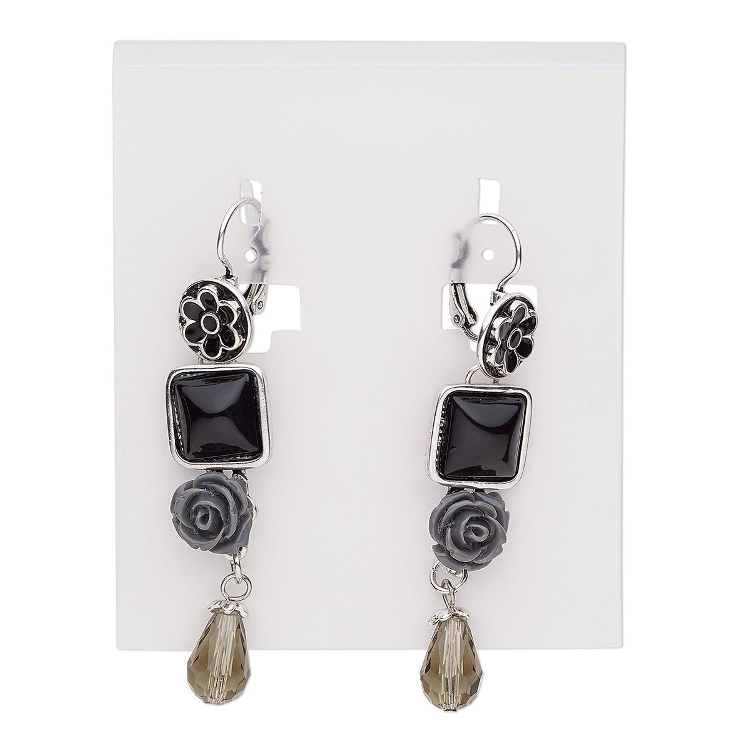 Earring, enamel / glass / resin / antique silver-plated brass / steel / "pewter" (zinc-based alloy), grey / smoky grey / black, 2-1/2 inches with round and square with leverback ear wire. Sold per pair.