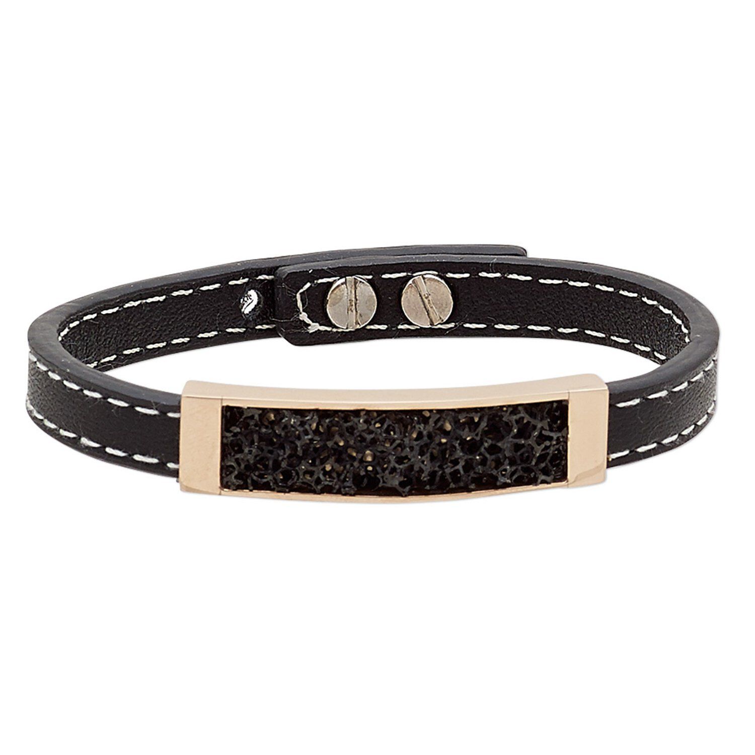 Ready-to-wear bracelet is ideal for gift-giving, counter sales or extending current jewelry lines. Bracelet features flat leather design with textured, rose gold-finished brass rectangle centerpiece. Bracelet is adjustable at 6-1/2 and 7 inches.