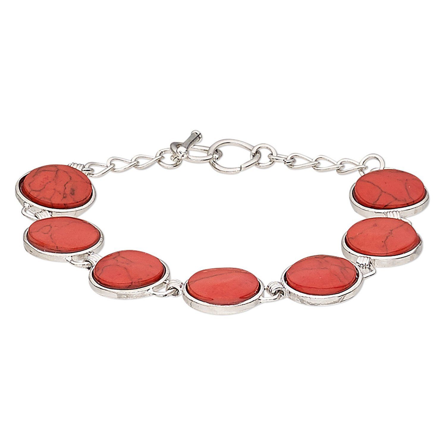 Lightweight, silver-plated brass bracelet is highlighted by red magnesite rounds that will surely draw the eye with their bold colors. Colors, shapes and sizes may vary in each lot.