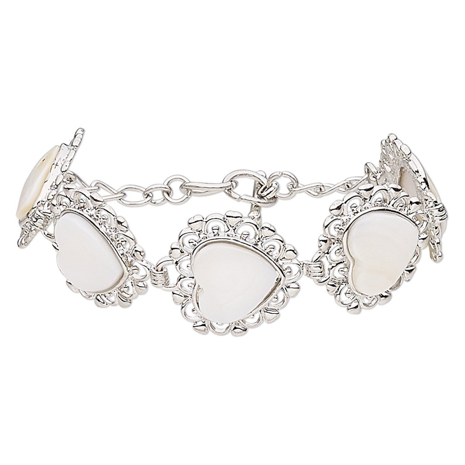 Lightweight, silver-finished brass bracelet is highlighted by heart-shaped gold lip shells that will surely draw the eye with their iridescent shimmer. Colors, shapes and sizes may vary in each lot.