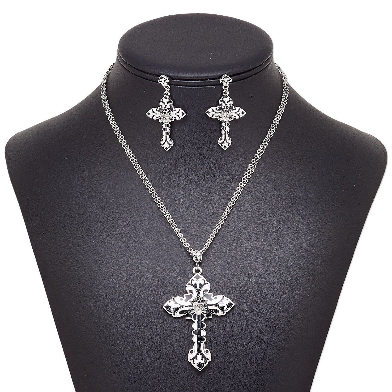 Necklace and earring set, Avant-Garde Jewelry Collection, enamel / Czech glass rhinestone / imitation rhodium-plated brass, black and white, 56x40mm cross with skull design, 15" to 16" necklace with 2-inch extender chain and lobster claw clasp, 48mm earrings with post. Sold per set.