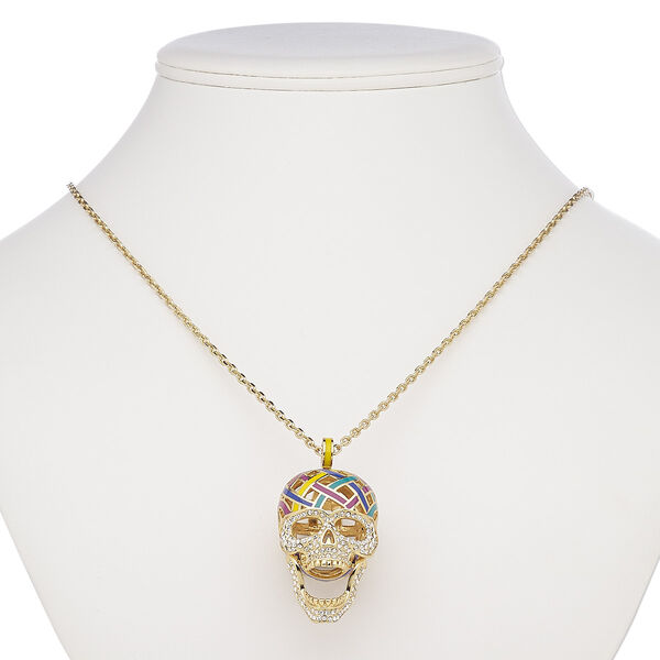 Necklace, Avant-Garde Jewelry Collection, enamel / Czech glass rhinestone / gold-plated brass, multicolored, 39x26mm skull with hinged jaw, 24 inches with 2-inch extender chain and lobster claw clasp. Sold individually.