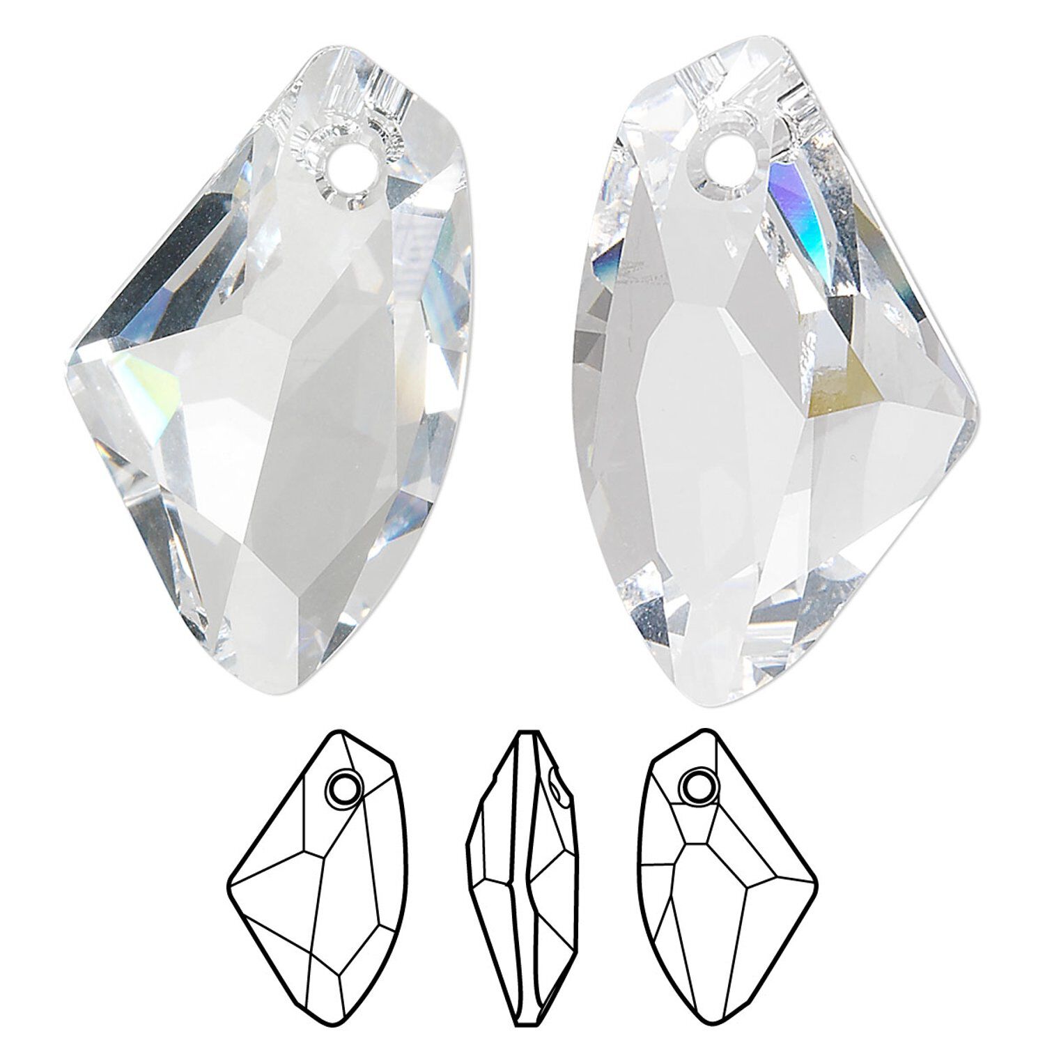 Create a sparkling, celestial style with galactic pendant components from Swarovski®. The exceptional, angular cut sets the galactic crystals apart from the traditional collection of crystal components. With a top drill hole, the component dangles lengthwise. Add an ice-pick bail to make a brilliant pendant. Hole size and placement may vary slightly.