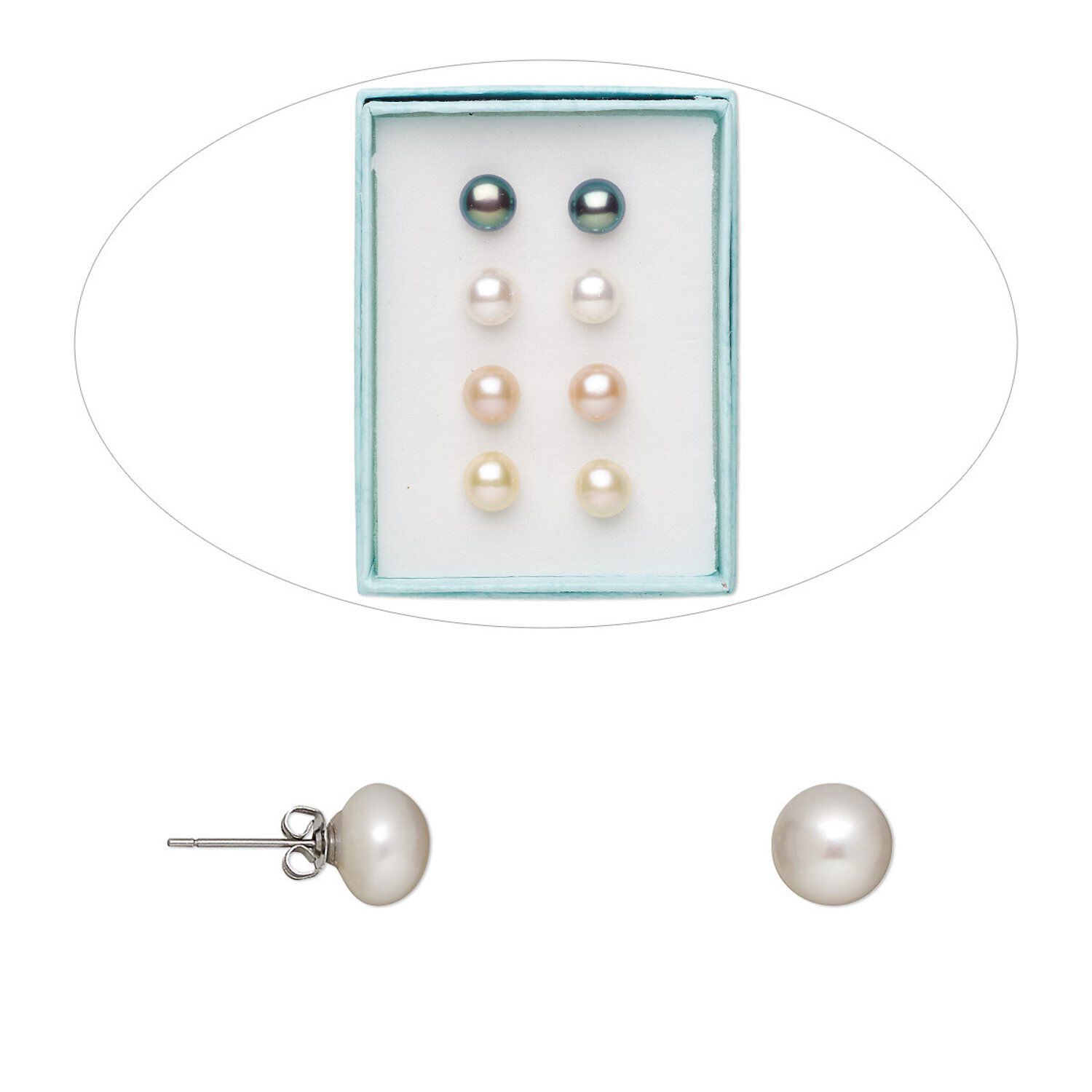 Cultured freshwater pearl earrings feature stainless steel earstuds and come in packs of four pairs. Colors can include white, mauve, peach and Tahitian. Since pearls are a natural material, color and size will vary. Pearls will vary in color from cream to mauve to peach in a variety of hues.