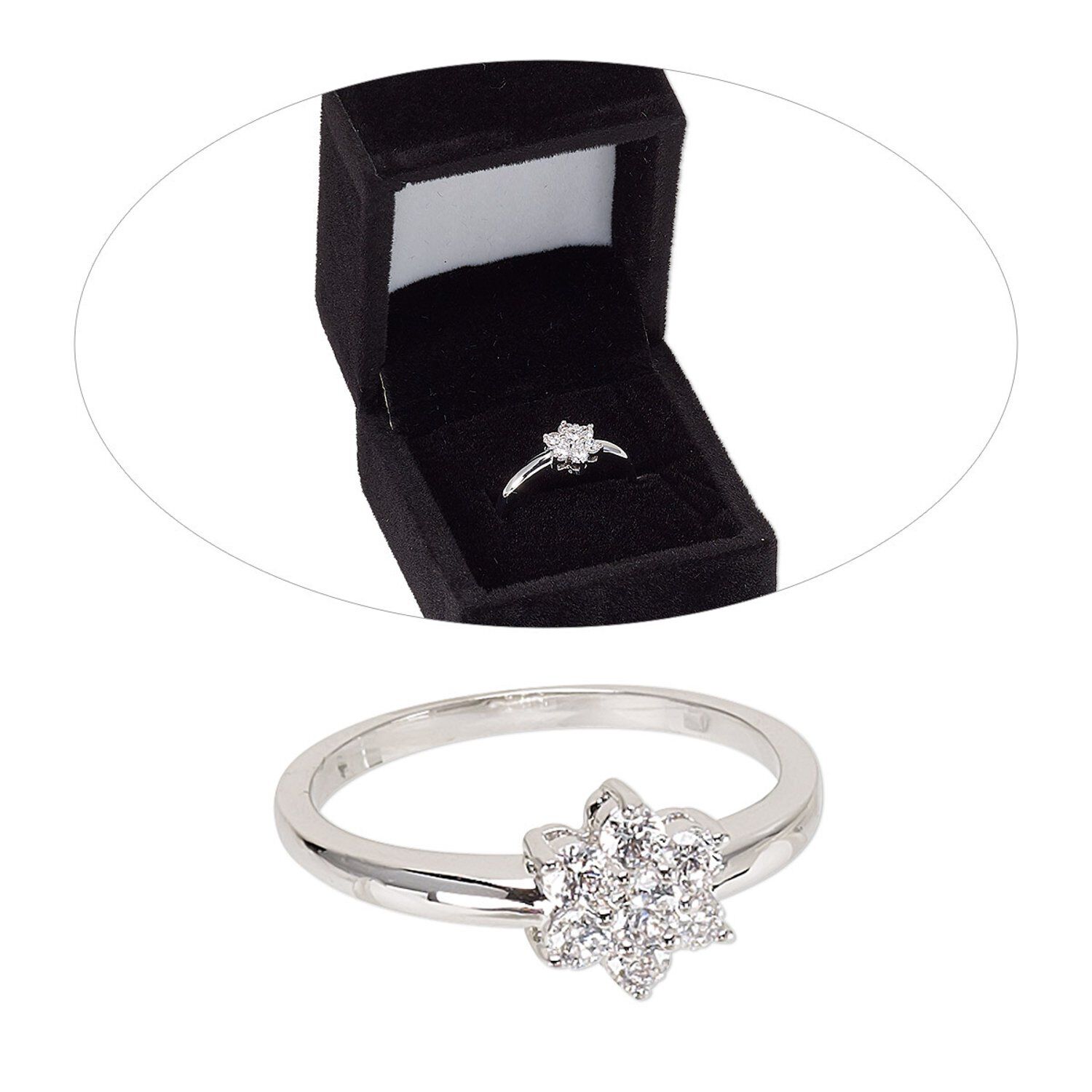 Ring, cubic zirconia and rhodium-finished brass, clear, 8.5mm flower, size 8. Sold individually.