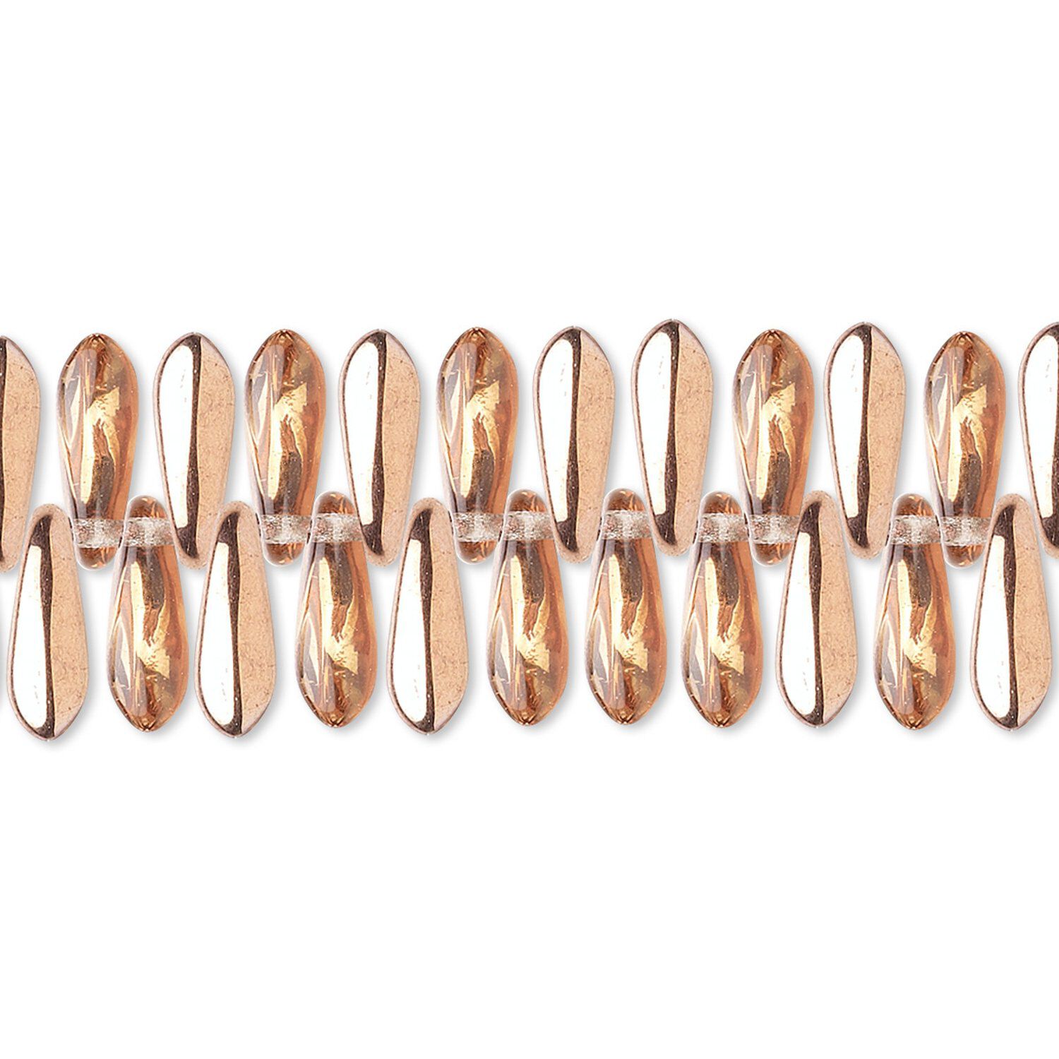 Top-drilled clear with half-coat copper daggers have slender, petal-like shapes. They can be used as earring drops, and add flashes of color and shine to necklace designs when used as spacers between smaller beads.