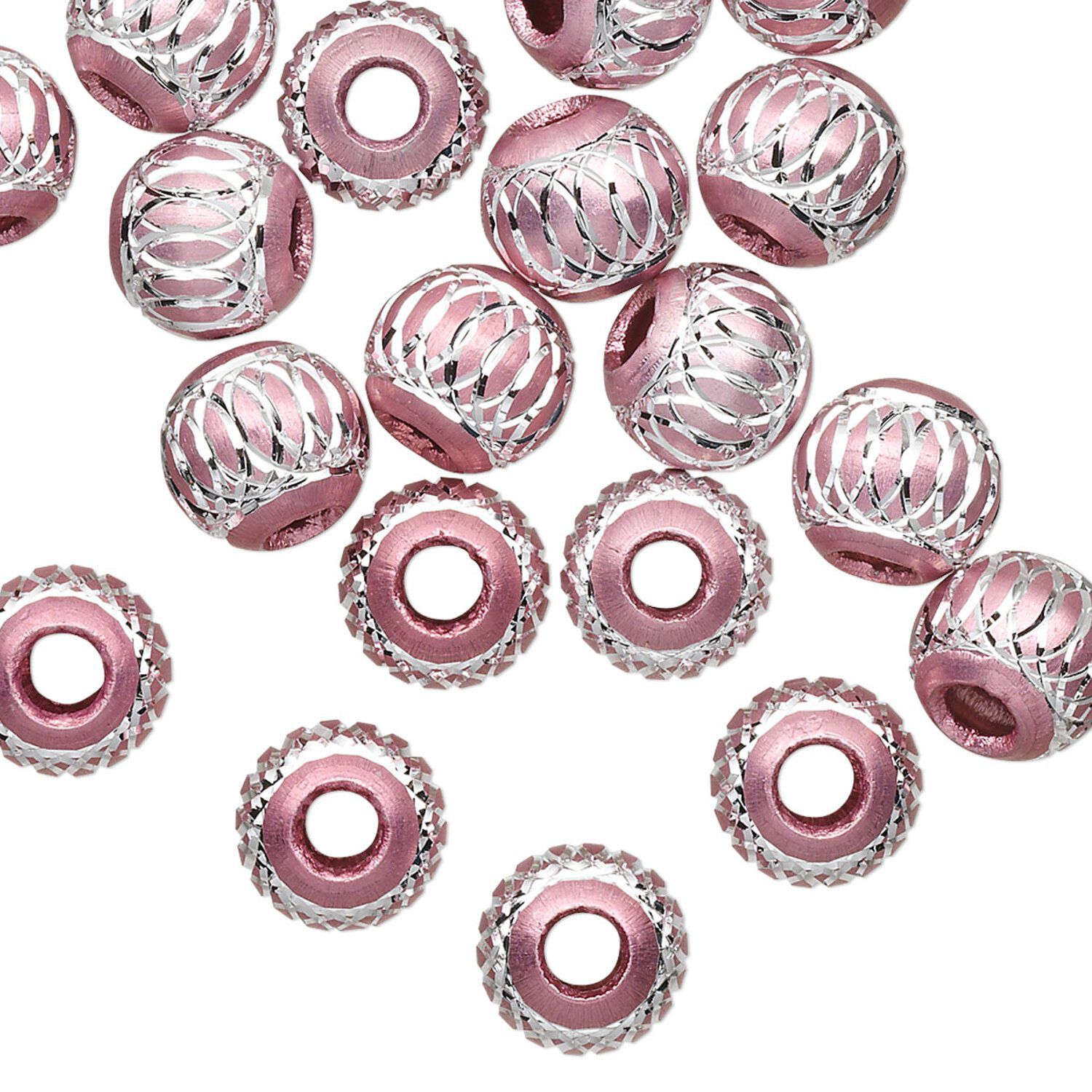 Festive, fun and lightweight beads. Aluminum base metal with color-coating. Diamond cut adds flash to silver coloring. Large drill holes accommodate wide cord.