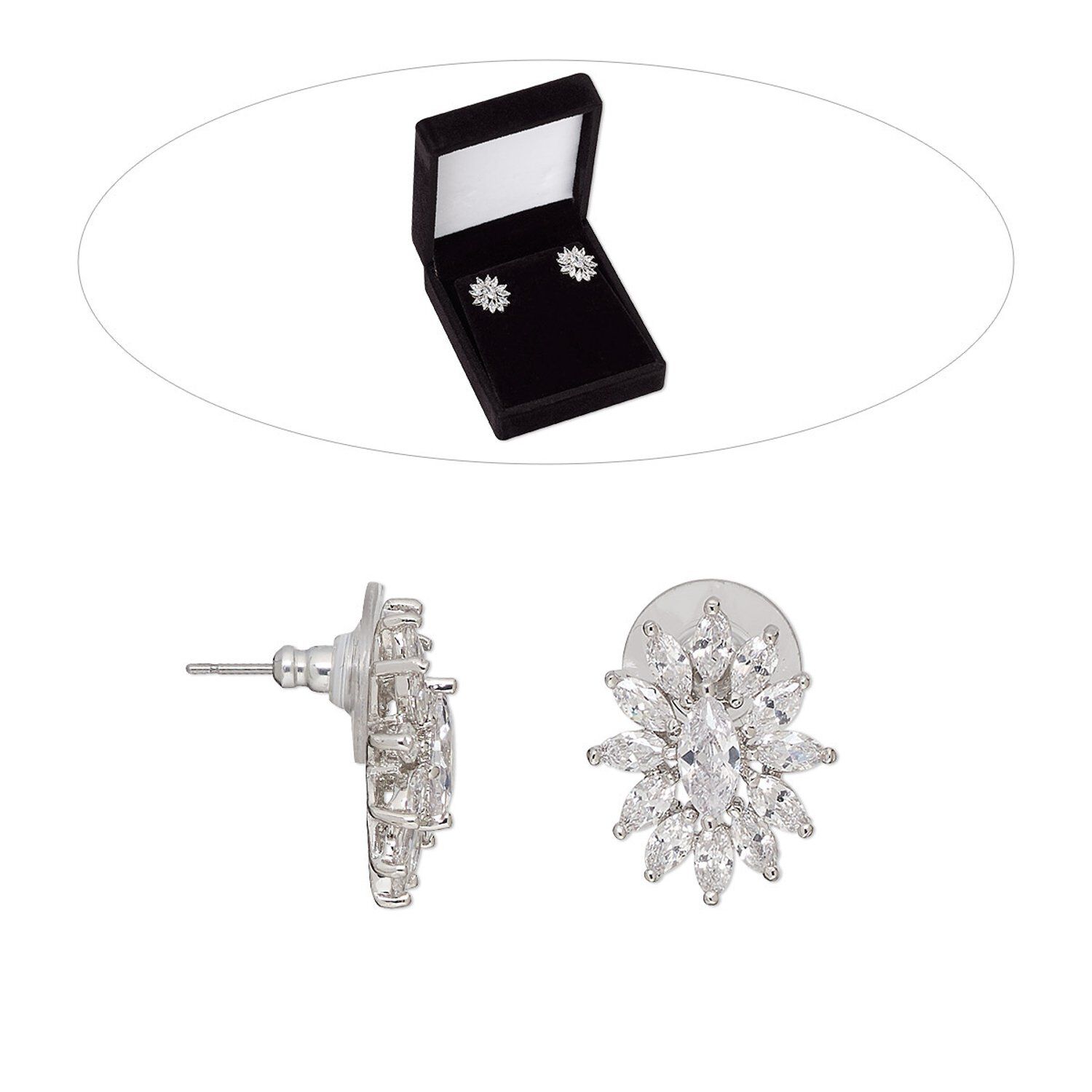 Earstud, cubic zirconia / stainless steel / rhodium-finished brass, clear, 19.5mm flower with post. Sold per pair.