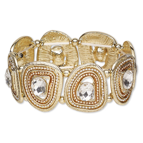 Bracelet, stretch, glass rhinestone / silver- / copper-plated / gold-finished "pewter" (zinc-based alloy), clear, 28mm wide with freeform, 6-1/2 inches. Sold individually.