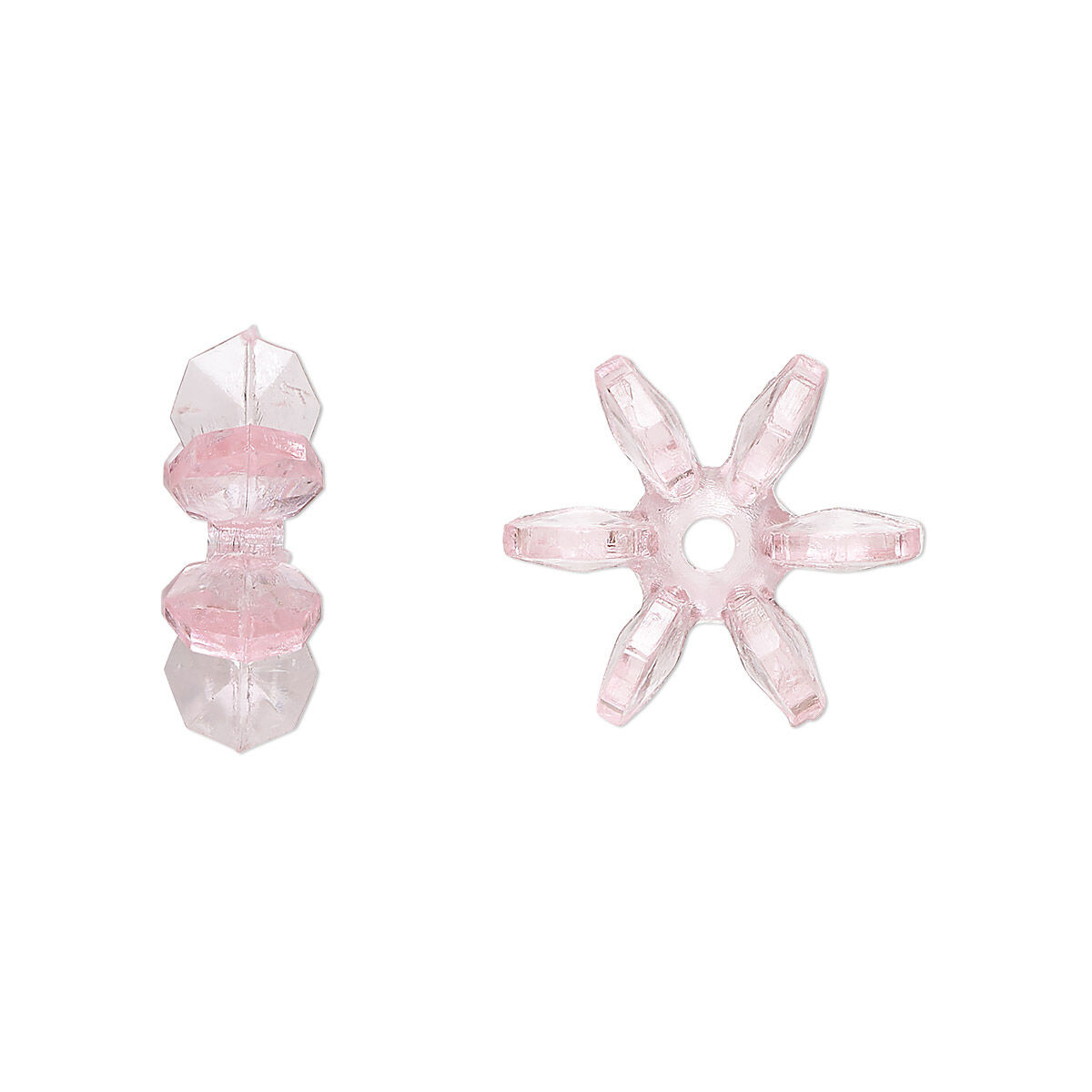 Made of transparent light pink acrylic, these paddle beads have been injection molded for consistent size, shape and surface. Lightweight and economical, they are ideal for stringing projects, fabric embroidery, embellishment and holiday ornaments . These beads nest into each other to create unique designs seen most often employed in holiday ornaments.