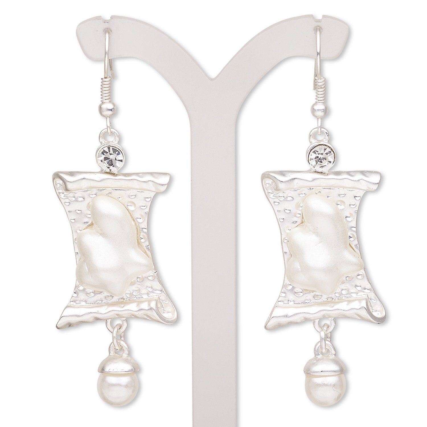 These eye-catching earrings in silver-finished brass and "pewter" (zinc-based alloy) feature a scroll design hung with round acrylic pearl dangles. The scrolls are set with freeform acrylic embellishments and topped with glass rhinestones. Fun and fashionable, these earrings will attract shoppers to any sales counter. Colors, shapes and sizes may vary in each lot. Rubber earnuts included.