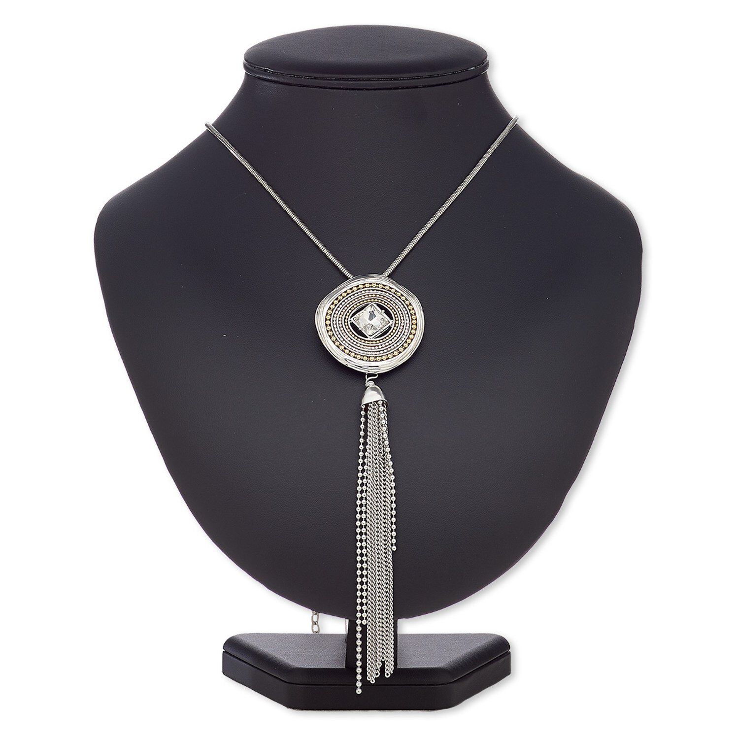 Necklace, glass rhinestone / silver-coated plastic / silver-plated steel / antique silver-plated "pewter" (zinc-based alloy) / gold-finished / copper- / silver-plated brass, clear, 44mm round with 2-1/2 inch tassel, 36 inches with 2-inch extender chain and lobster claw clasp. Sold individually.