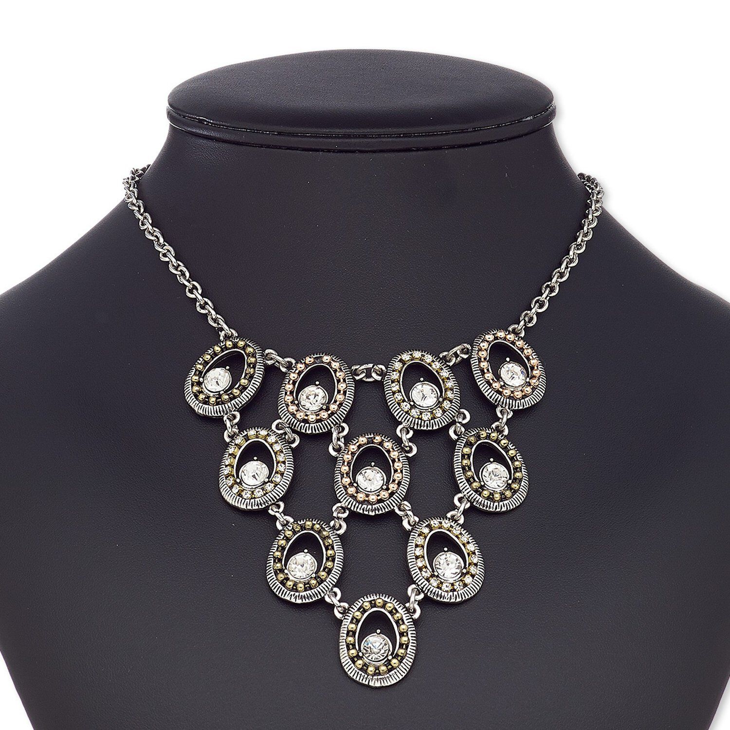 Necklace, glass rhinestone / antique silver-coated plastic / antique silver-plated brass / steel / "pewter" (zinc-based alloy) / gold- / rose gold-finished / antique brass-plated brass, clear, oval, 16 inches with 2-inch extender chain and lobster claw clasp. Sold individually.