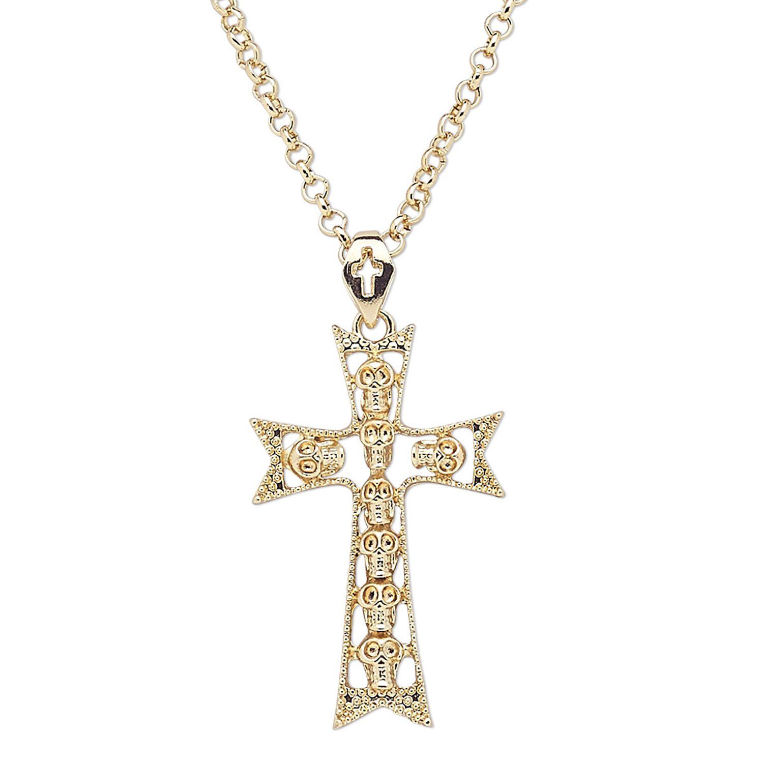 Gold-finished steel and "pewter" necklace features a cross pendant filled with small skulls. Colors, shapes and sizes may vary in each lot.