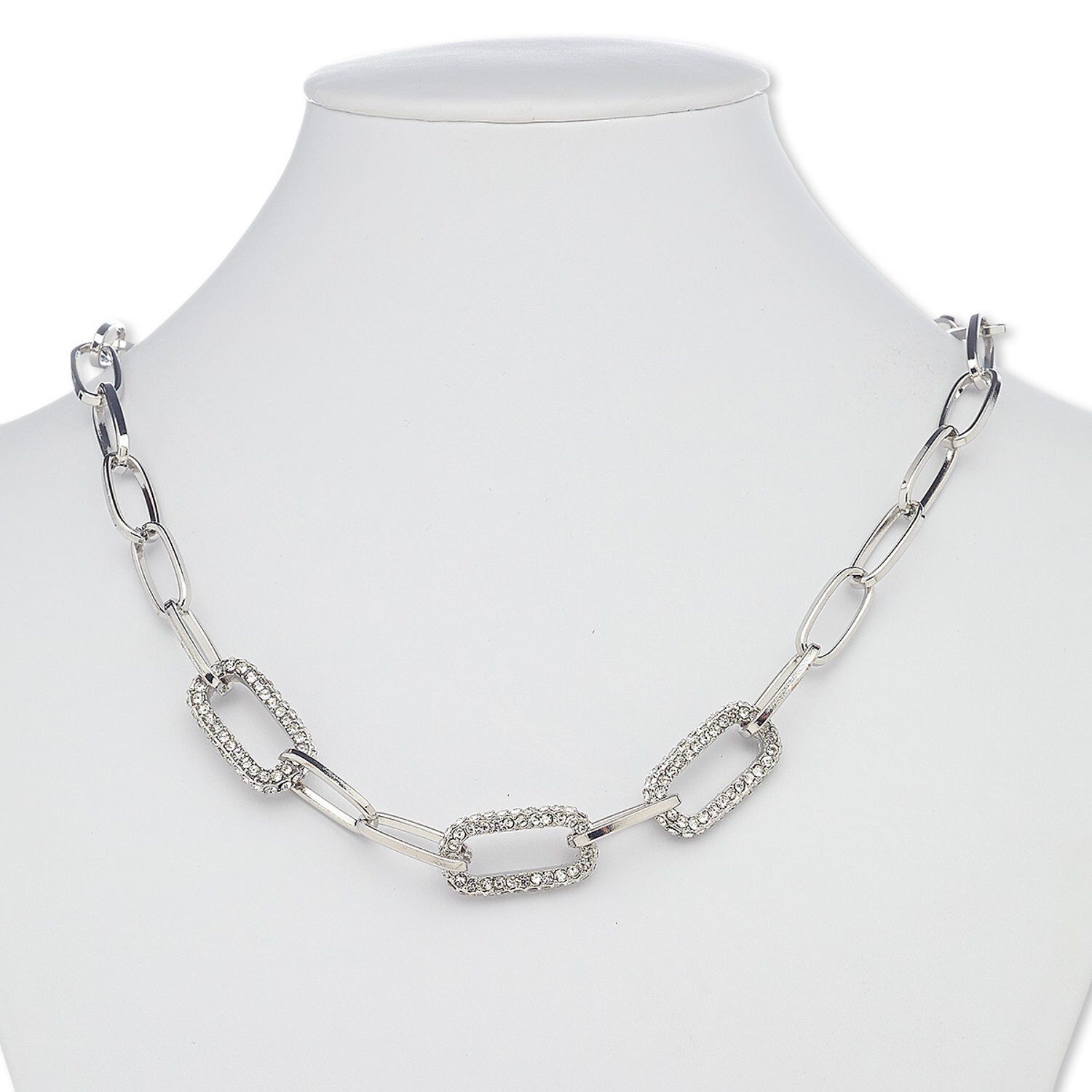 Necklace, glass rhinestone with silver-plated steel and "pewter" (zinc-based alloy), clear, link, 15 inches with 2-inch extender chain and lobster claw clasp. Sold individually.
