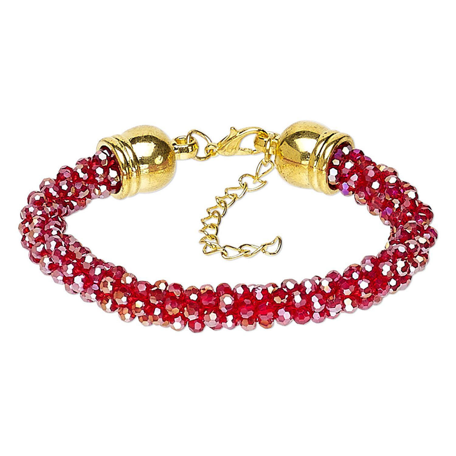 Bracelet, glass / gold-coated plastic / gold-finished steel / "pewter" (zinc-based alloy), red AB, 7.5mm wide, 7 inches with 2-inch extender chain and lobster claw clasp. Sold individually.