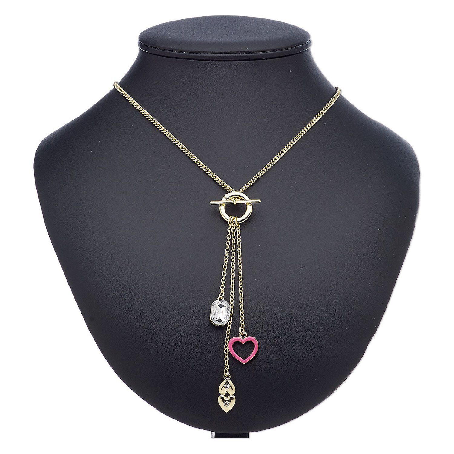 This gorgeous necklace features three different-length dangles showcasing an enameled heart, clear acrylic faceted rectangle and double heart with clear glass rhinestone accents. The bright gold finish gives this necklace luxe appeal, but with a more than affordable price tag.