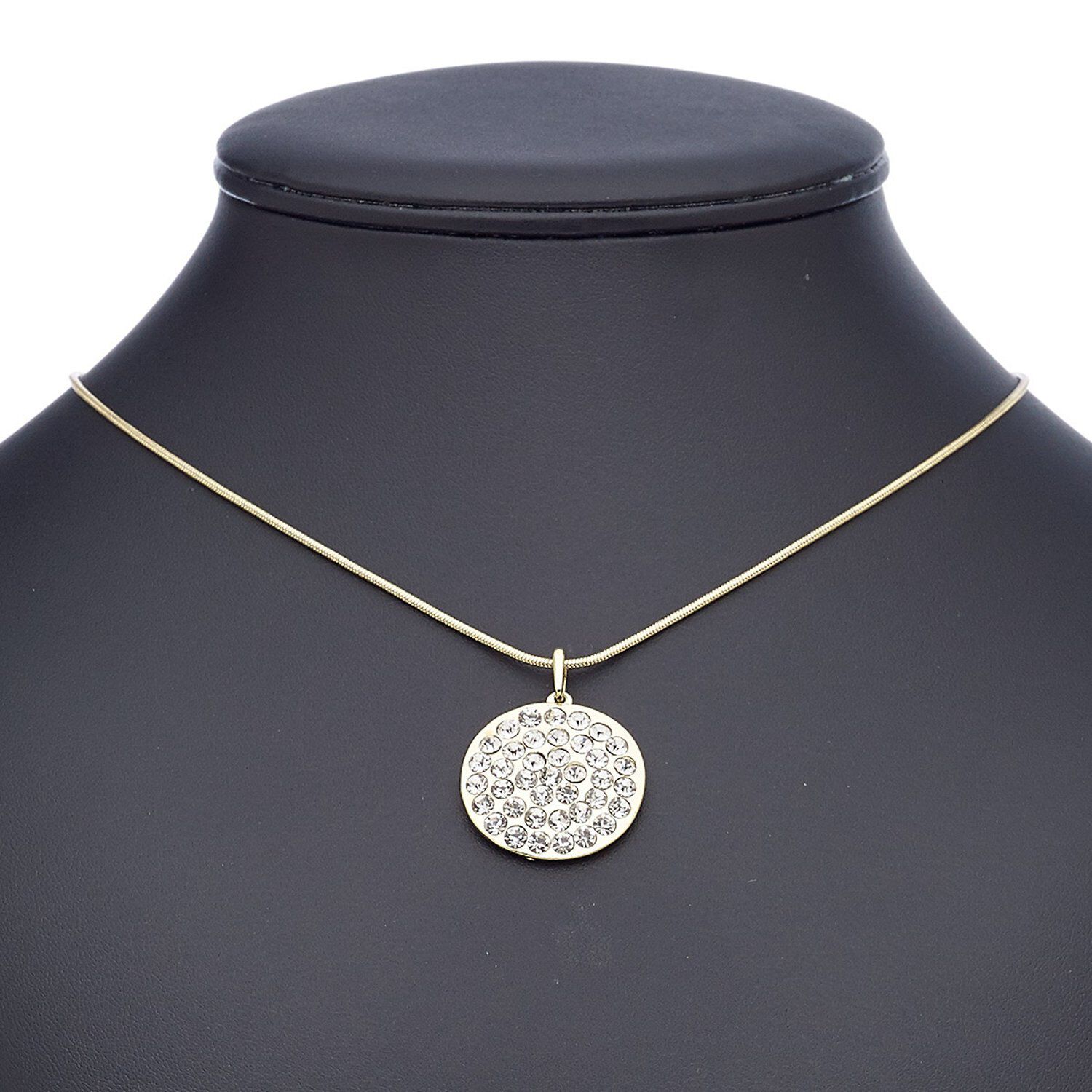 Shine on while wearing this rhinestone-studded necklace. The glitter of gold finish and eye-catching bling of clear faceted glass combine on a round pendant to produce a rich appearance without an expensive price tag.