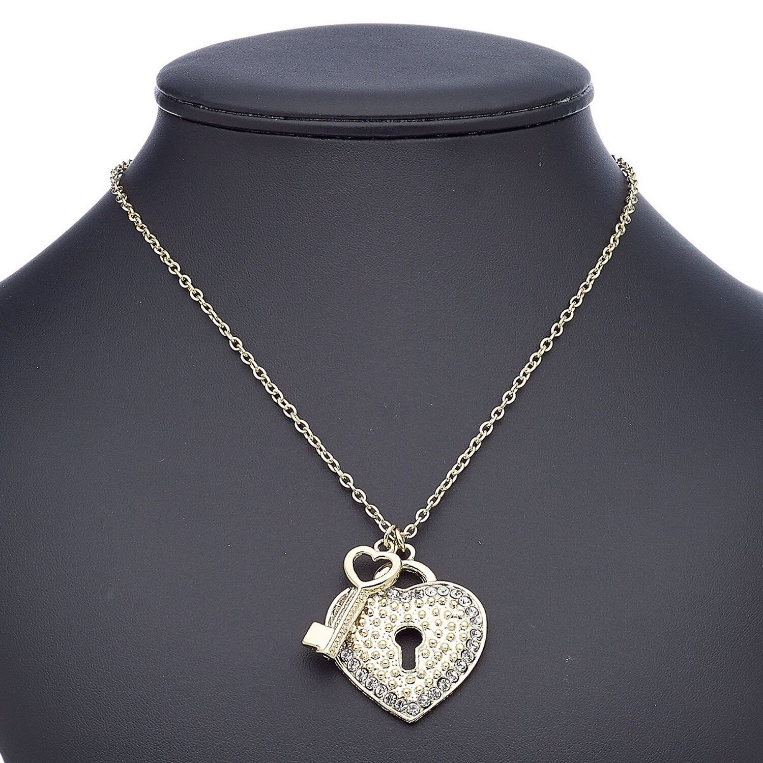 Lock in sales with this gold-finished necklace sporting plenty of detail and glinting faceted glass rhinestones for plenty of eye-catching bling. Locks and keys are enchanting designs found throughout the ages in cultures worldwide and have represented unlocking physical, as well as metaphorical, barriers.