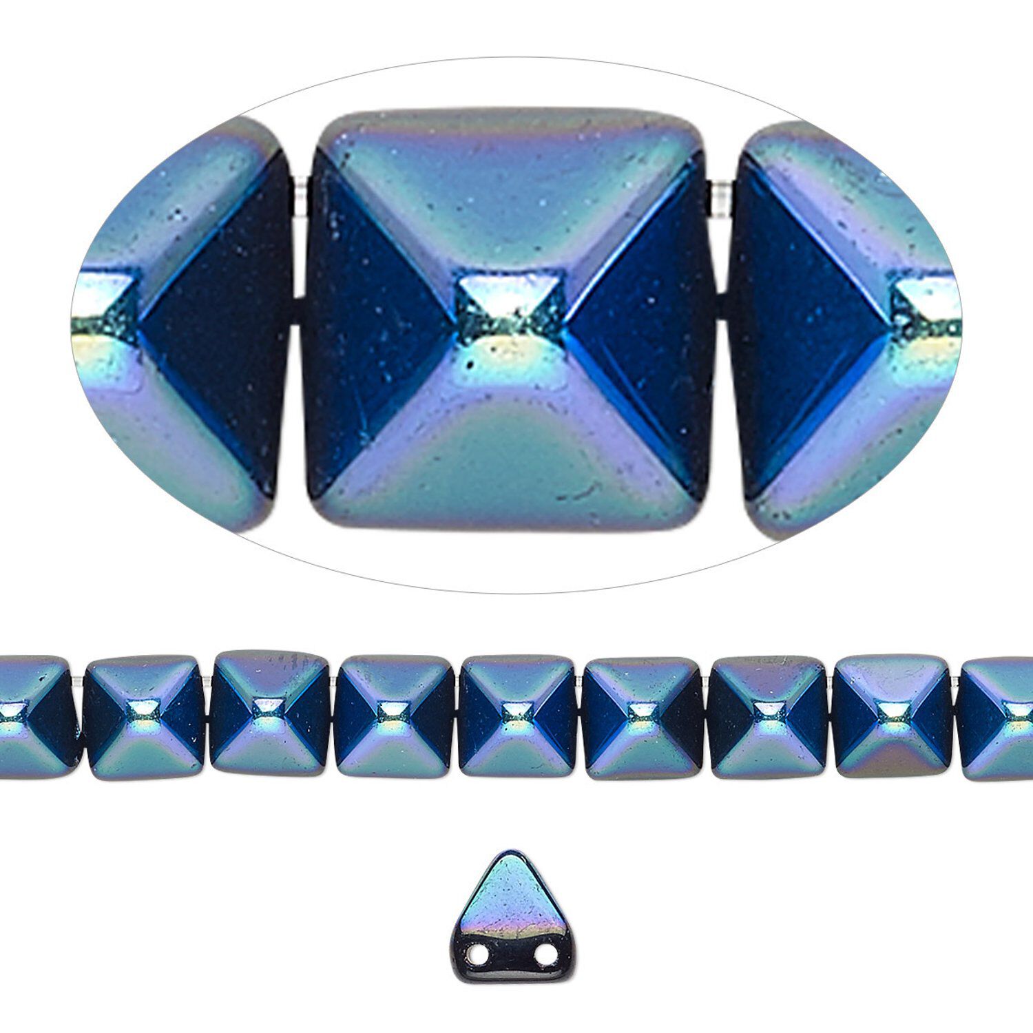 Innovative Czech pressed glass pyramid spacers with two stringing holes are advantageous for multi-strand designs or bead-weaving projects. The base is flat so necklace and bracelet designs rest comfortably flush against skin when worn. Size and shape may vary slightly and color may vary from dye lot to dye lot.