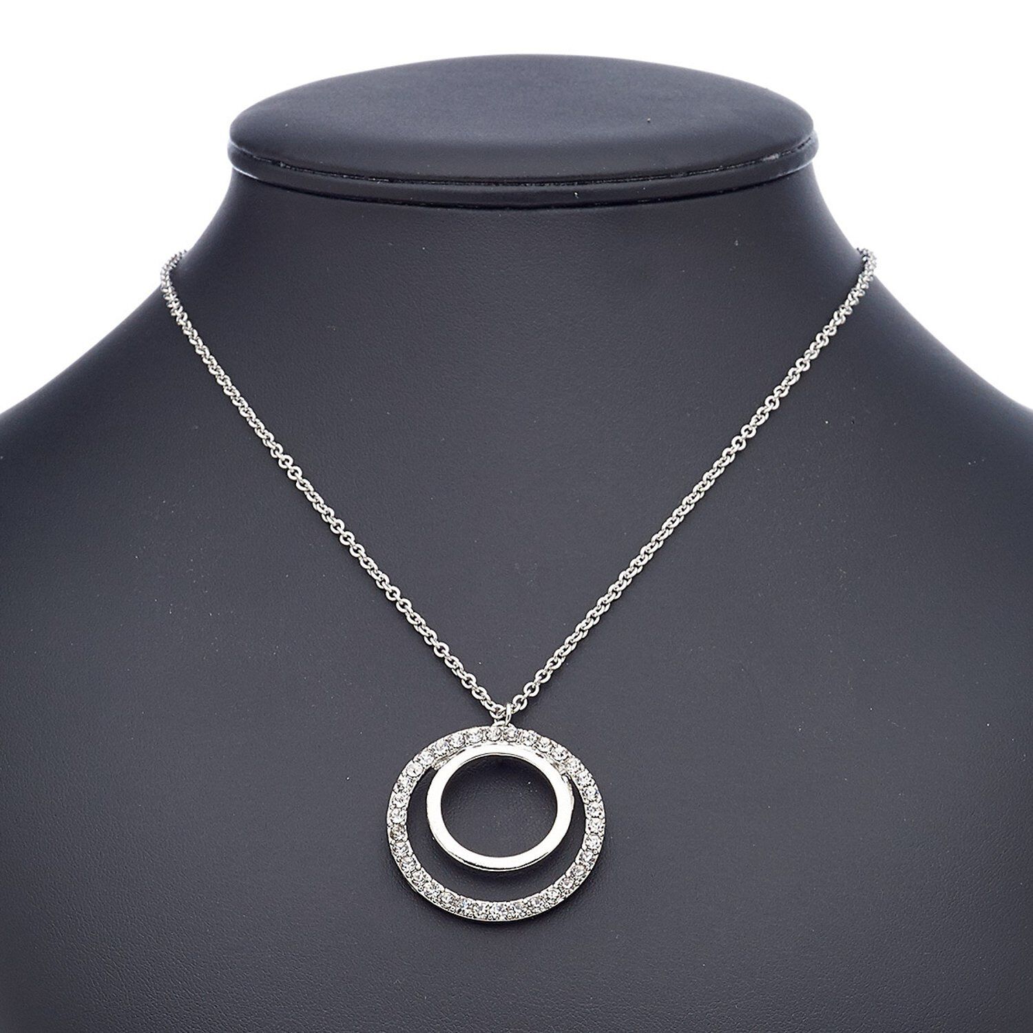 For elegant understated appeal, this imitation rhodium-finished necklace is just the ticket. A double open round pendant dangles at the center of the lightweight chain with the outermost circle encrusted in the glittering flash of faceted glass rhinestones for an upscale appearance without a high-end cost.