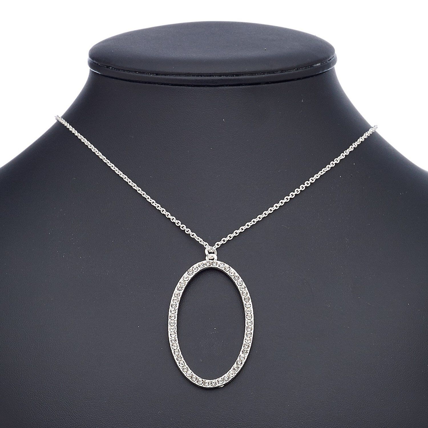 For elegant understated appeal, this imitation rhodium-finished necklace is just the ticket. An open oval pendant dangles at the center of the lightweight chain and is encrusted with the glittering flash of faceted glass rhinestones for an upscale appearance without a high-end cost.