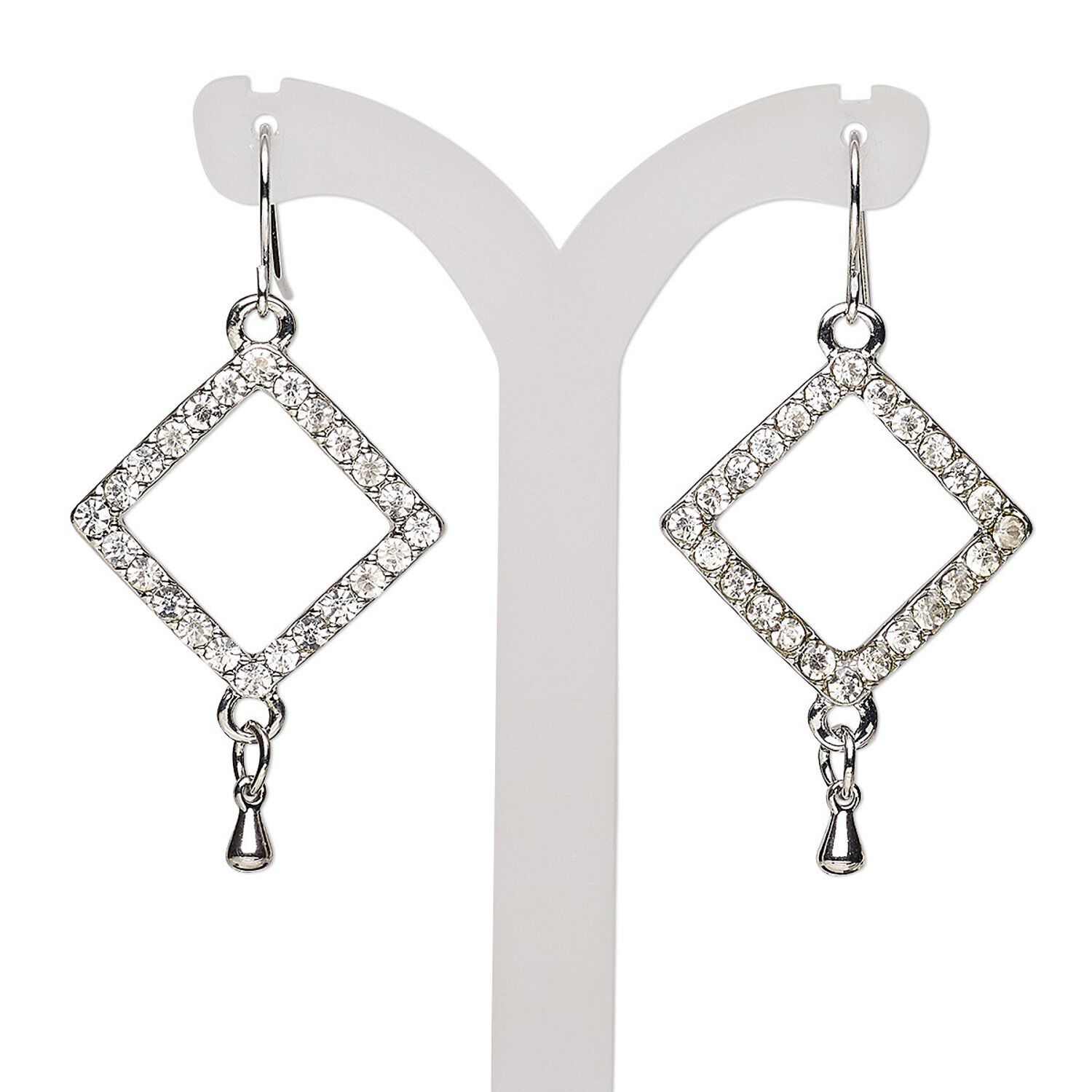 Earring, glass rhinestone with imitation rhodium-finished steel and "pewter" (zinc-based alloy), clear, 2 inches with open diamond and fishhook ear wire. Sold per pair.