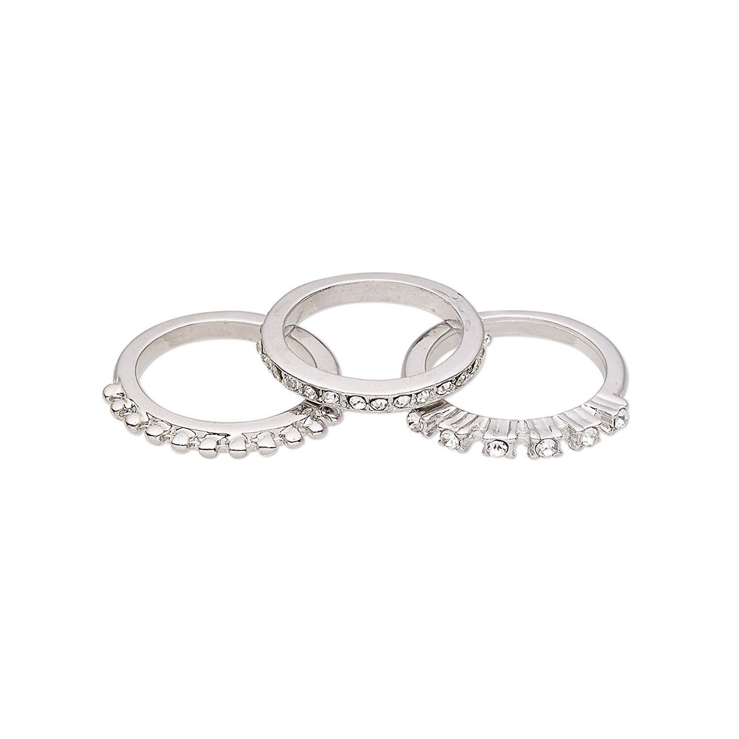 Capitalize on the stacked ring trend while enjoying some serious bling. Two of the three imitation rhodium-finished ring bands shimmer with glass rhinestones while the third boasts a raised design resembling ball chain. Wear one, two or all three for a seriously stylish statement. Rings can vary in size by a quarter size.