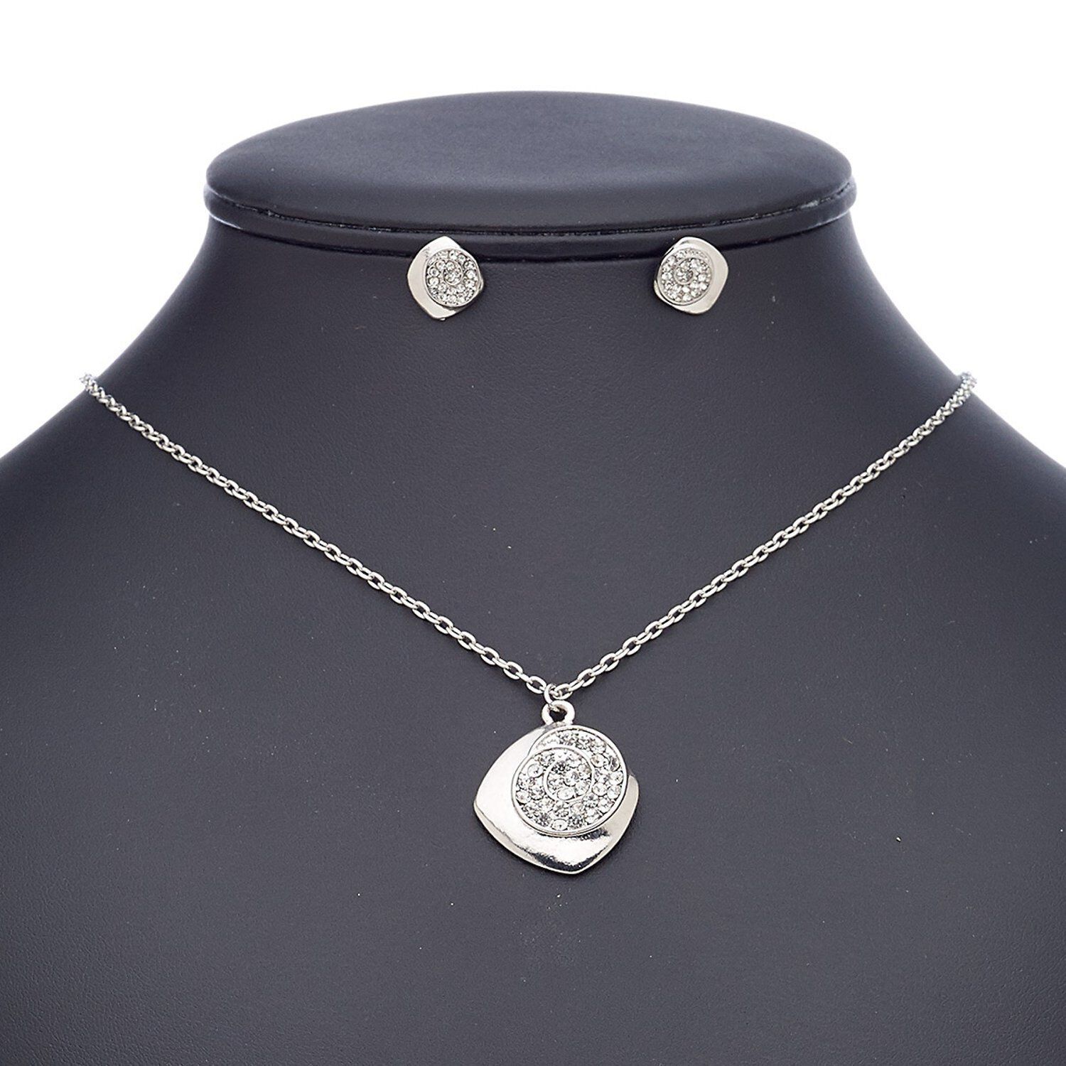 For elegant understated appeal, this imitation rhodium-finished necklace and earring set is just the ticket. A freeform pendant dangles from the center of glistening chain and is accented by a swirl of faceted glass rhinestones. Glimmering post earrings match the necklace pendant on a smaller scale to perfectly complete this jewelry set.