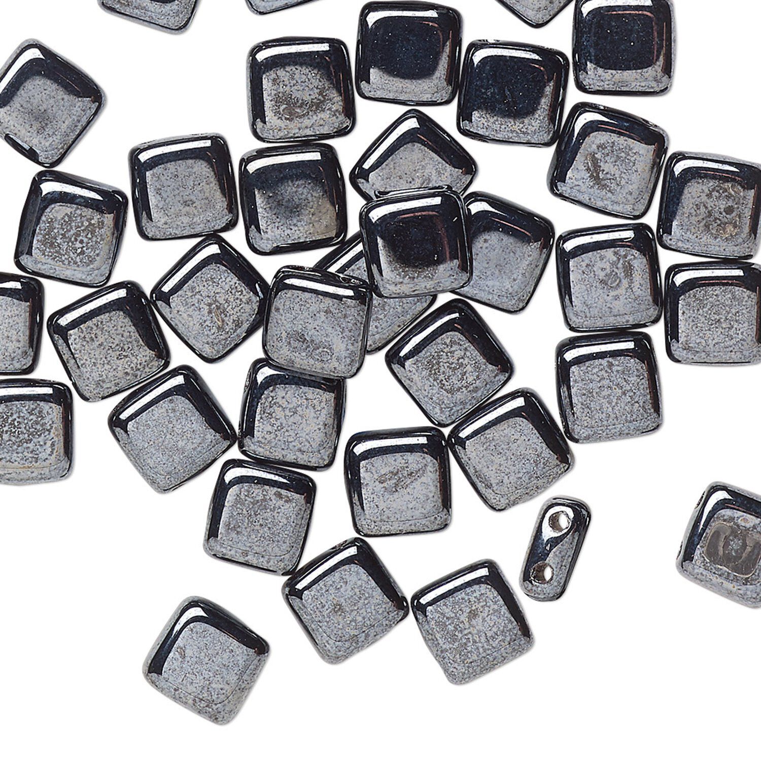 Bead, Preciosa, Czech pressed glass, opaque hematite, 6x6mm flat square with (2) 0.7mm holes. Sold per pkg of 40.