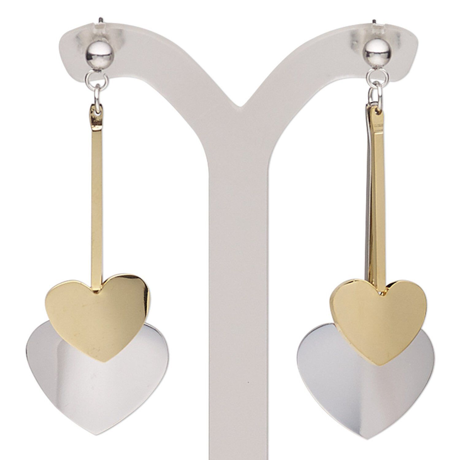Earring, stainless steel and gold-finished stainless steel, 2 inches with heart and post. Sold per pair.