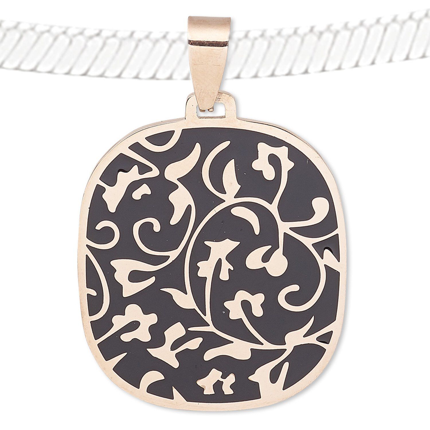 Pendant, enamel and rose gold-finished stainless steel, black, 35x32mm rounded rectangle with vine design. Sold individually.