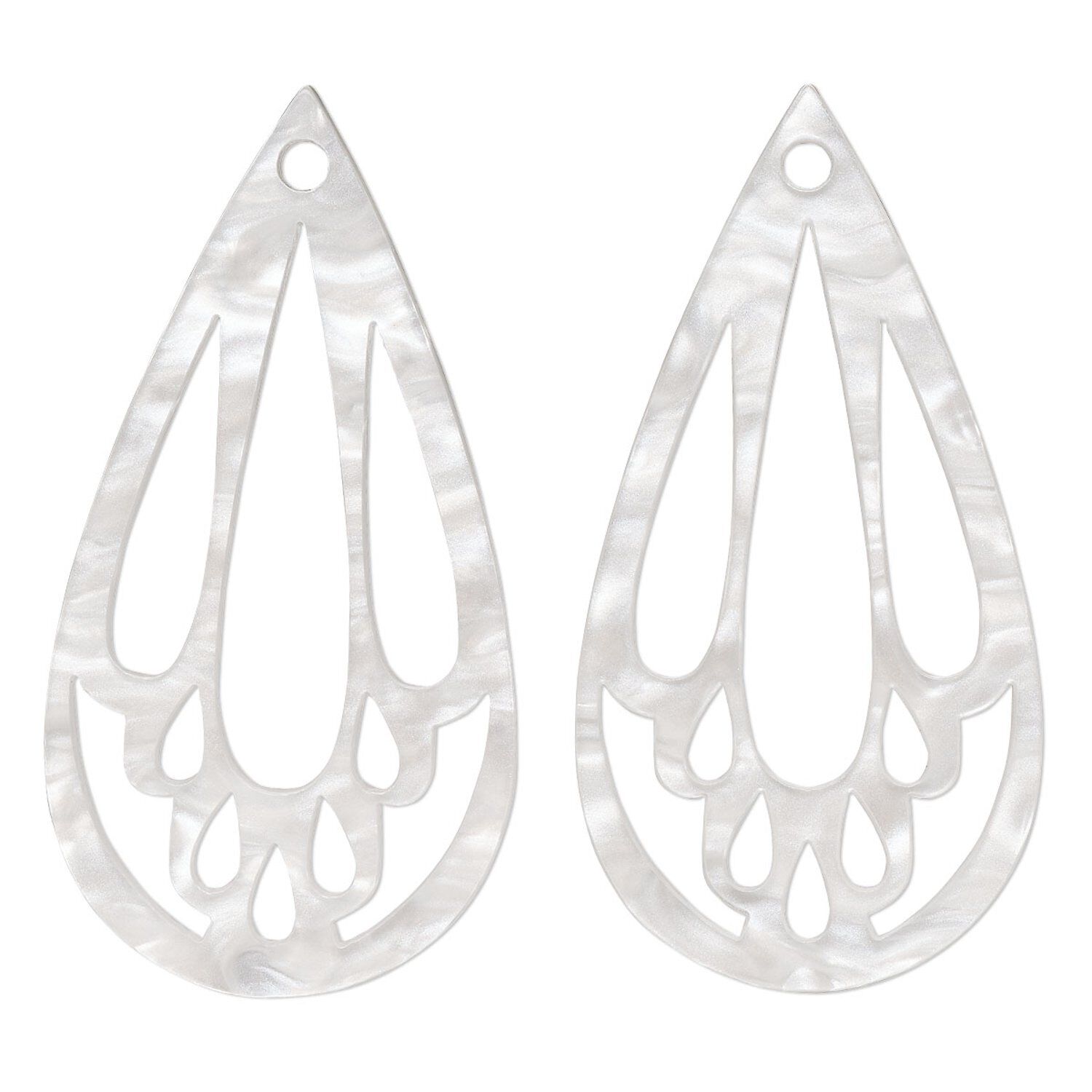 Elegant teardrop focals are embellished with delicate, lacy cutouts like butterfly or dragonfly wings. Lightweight resin focals have a smooth surface and areas of sheen similar to mother-of-pearl. Cutouts and open spaces along the edges make it easy to add drops and other embellishments.