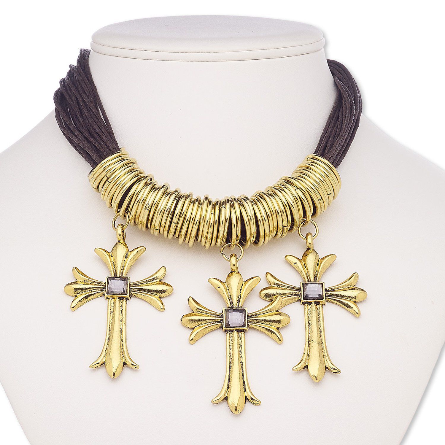 Necklace, multi-strand, waxed cotton cord / acrylic / antique gold-coated plastic / gold- / antique gold-finished steel / brass / "pewter" (zinc-based alloy), brown and grey, 2-3/4 x 1-3/4 inch three cross, 16 inches with 2-inch extender chain and lobster claw clasp. Sold individually.