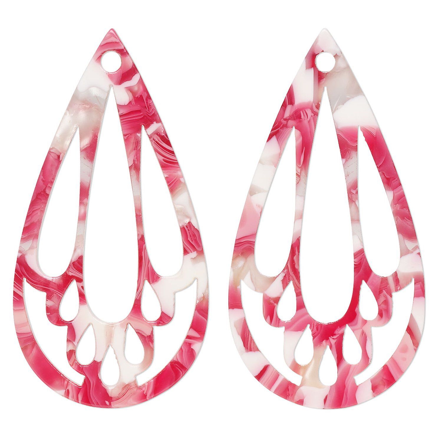 Focal, resin, pink / red / white, 49x25mm teardrop with cutouts. Sold per pkg of 4.