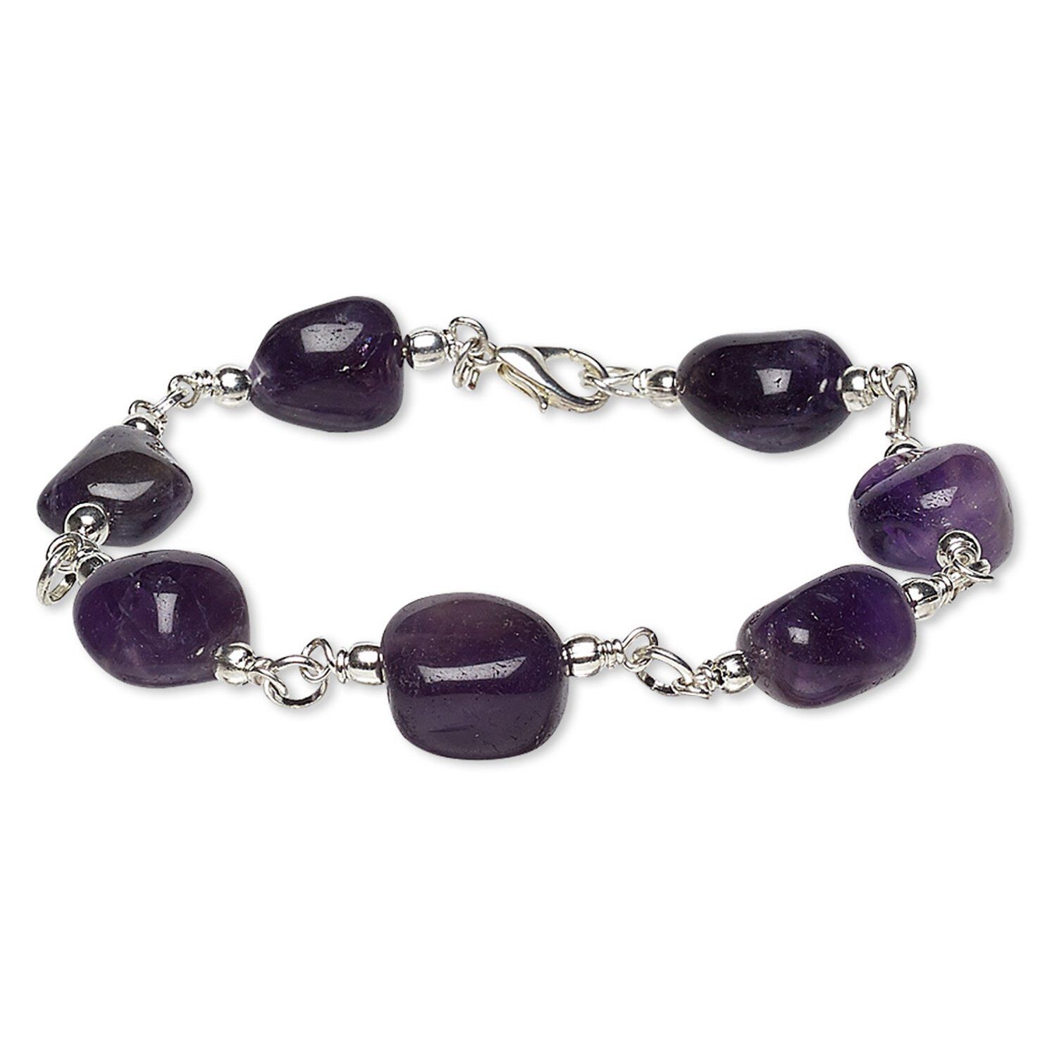 Bracelet, amethyst (natural / dyed) with silver-plated brass and steel, small to medium hand-cut nugget, 6 inches with lobster claw clasp. Sold individually.
