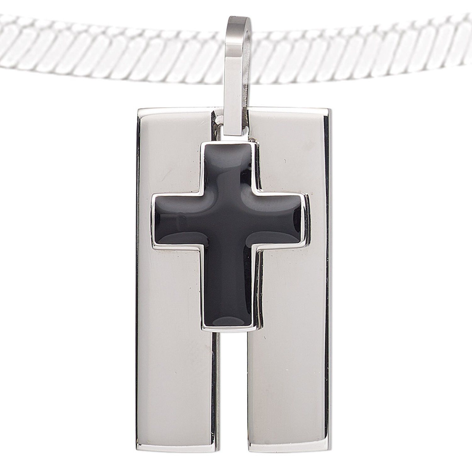 Featuring a dynamic cross design, this 316L stainless steel and black epoxy pendant offers a generous bail to accommodate leather or satin cord, chain and more. Retaining a rich color over time, stainless steel is durable, economical and resists rust or oxidation.