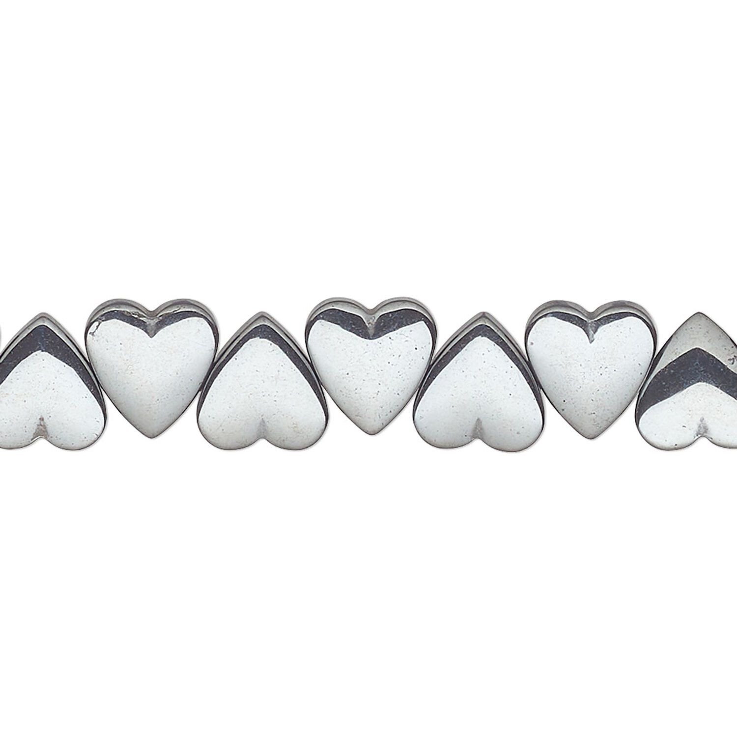 Add a touch of romance with these sweet heart beads. Horizontal drill holes allow the beads to hang upright in strung designs and as links or focals. These lustrous, metallic looking beads add richness wherever they appear.
