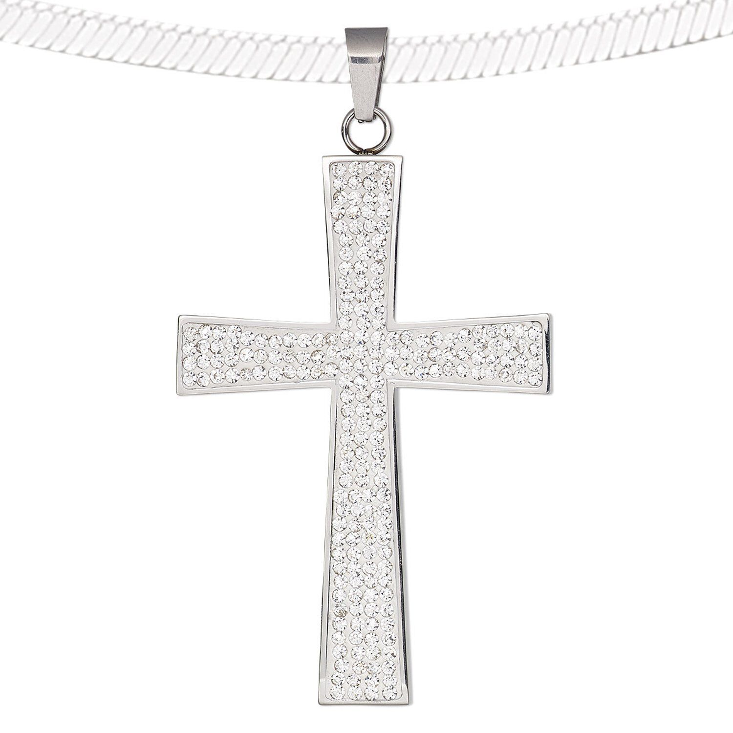 Elegant and striking, this 316L stainless steel cross pendant is beautifully accented by glass rhinestones set in white epoxy. Stainless steel is durable, economical and resists rust or oxidation.