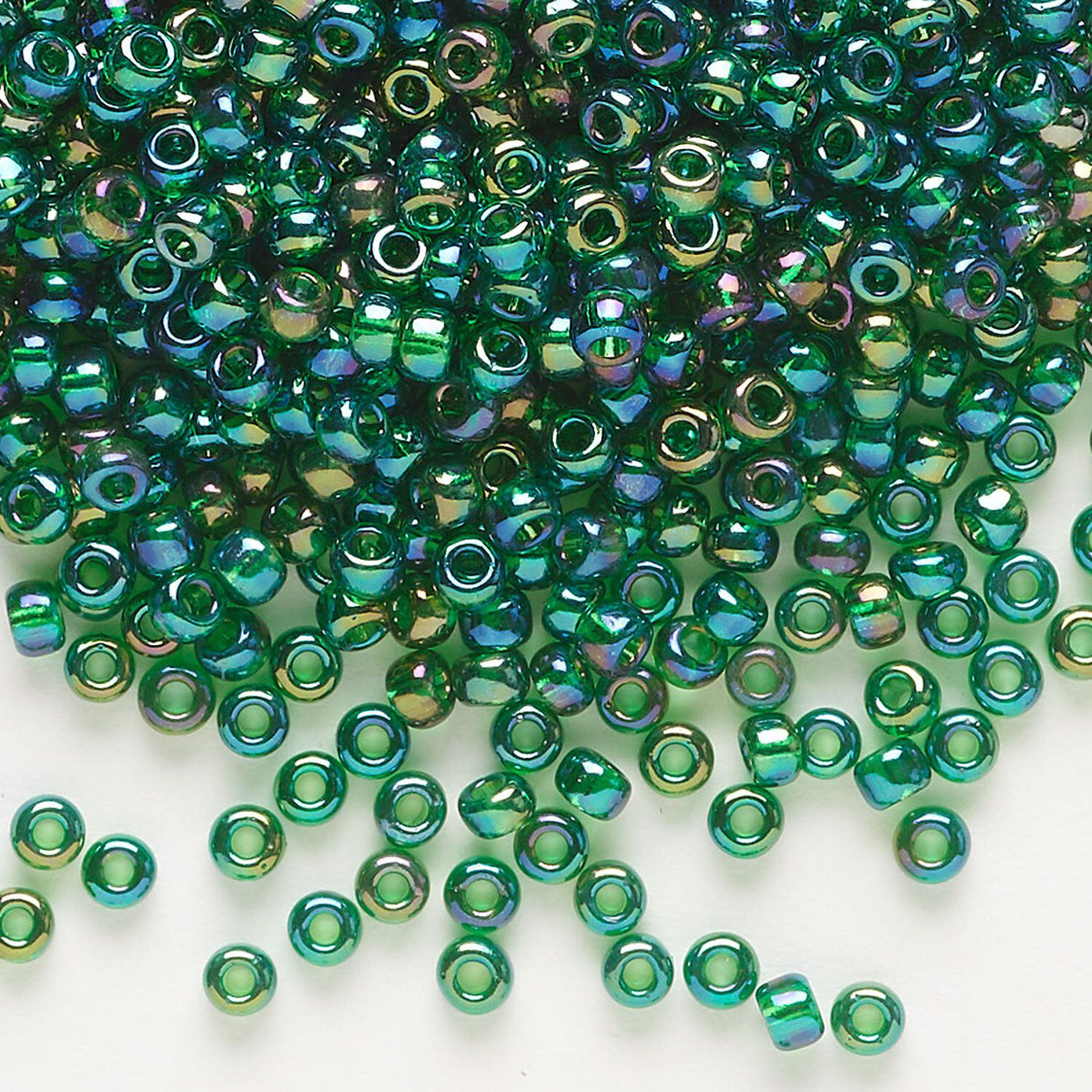 Seed bead, Dyna-Mites™, glass, transparent rainbow emerald green, #8 round. Sold per 1/2 kilogram pkg.