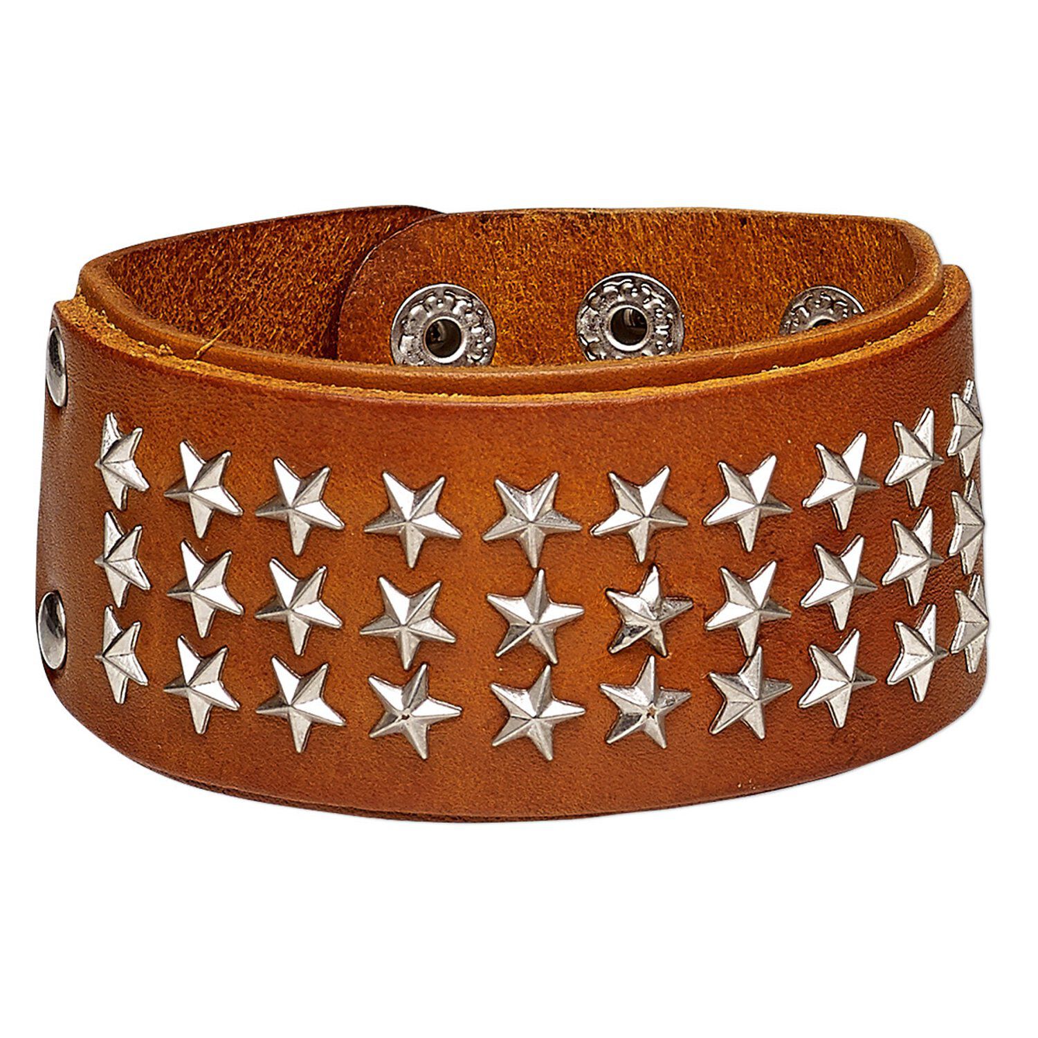 Bracelet, leather (dyed) with silver-plated steel and "pewter" (zinc-based alloy), tan, 41mm wide with star studs, adjustable from 5-1/2 to 7 inches with double snap closure. Sold individually.
