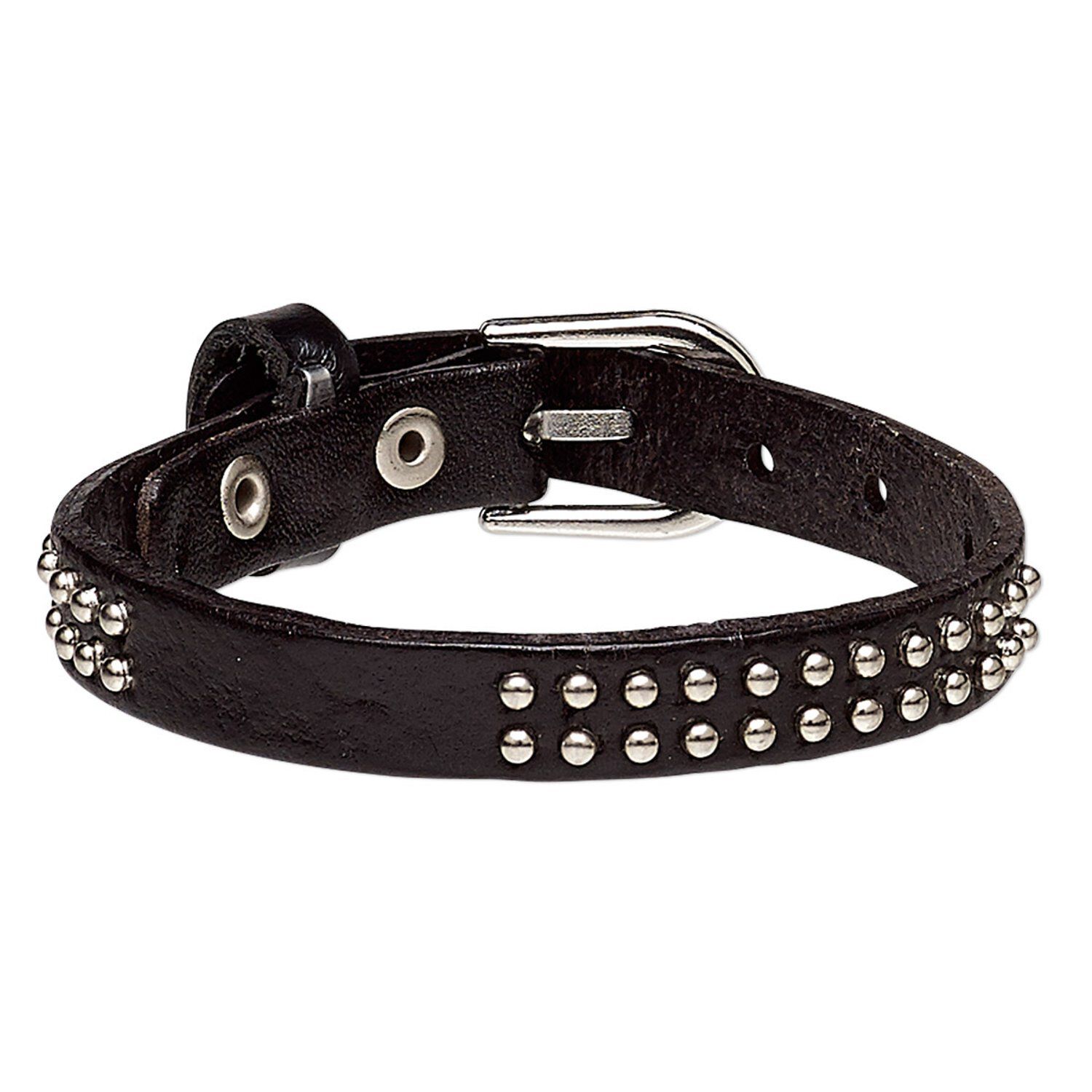 Bracelet, leather (dyed) and silver-plated steel, black, 10mm wide with round studs, adjustable from 6 to 7-1/2 inches with buckle-style closure. Sold individually.