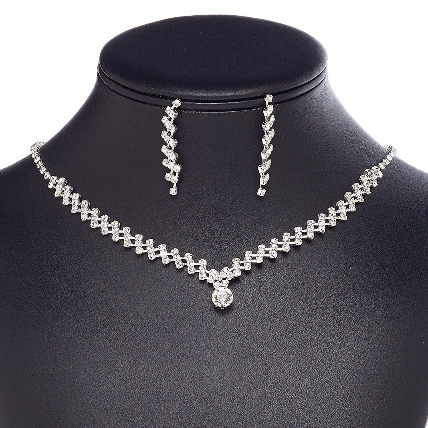 Stock this finished necklace and earring set for increased counter sales and expanding your finished jewelry lines. glass rhinestones provide sparkly, easy fashion. Comfort clutch earnuts included. Colors, shapes and sizes may vary in each lot.