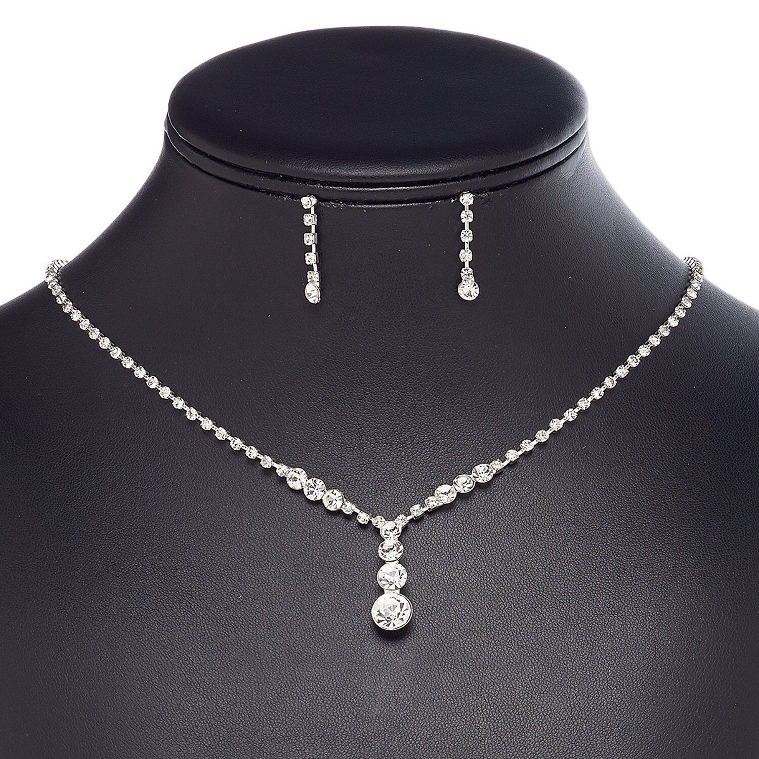 Stock this finished necklace and earring set for increased counter sales and expanding your finished jewelry lines. glass rhinestones provide sparkly, easy fashion. Comfort clutch earnuts included. Colors, shapes and sizes may vary in each lot.