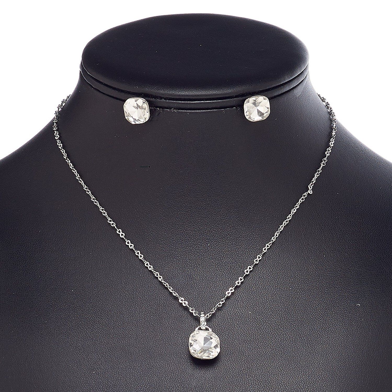 Necklace and earring set, glass / stainless steel / imitation rhodium-plated brass / steel / "pewter" (zinc-based alloy), clear, 12x12mm cushion, 15" to 16" necklace with 2-inch extender chain and lobster claw clasp, 10x10mm cushion with post. Sold per set.