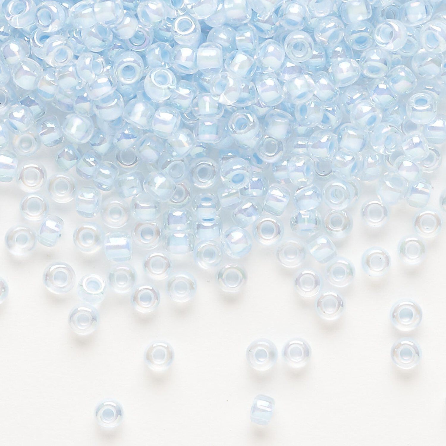 Seed bead, Dyna-Mites™, glass, translucent inside color rainbow ice blue, #8 round. Sold per 40-gram pkg.