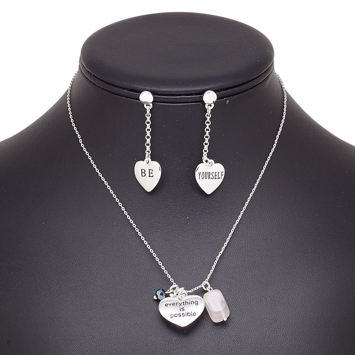 Necklace and earring set, rose quartz (natural) / glass / silver-plated brass / steel / "pewter" (zinc-based alloy), black hematite, heart, 15" to 16" necklace with 2-inch extender chain and lobster claw clasp, 45mm earrings with post. Sold per set.