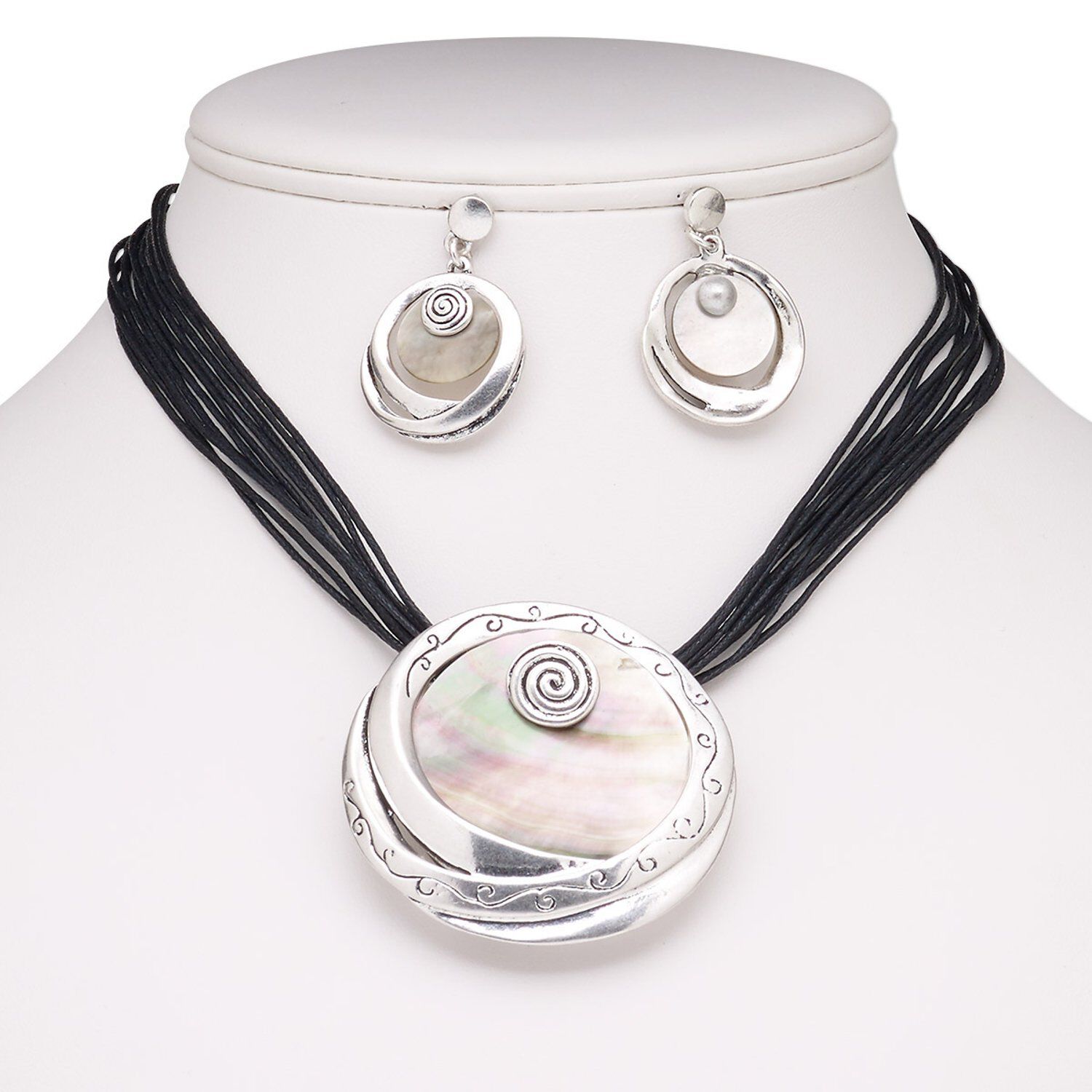 Necklace and earring set, Everyday Jewelry, 6-strand, black lip shell (natural) / waxed cotton cord / stainless steel / antique silver-plated steel / "pewter" (zinc-based alloy), black, 52mm round, 16 inches with 2-inch extender chain and lobster claw clasp, 37mm earrings with post. Sold per set.