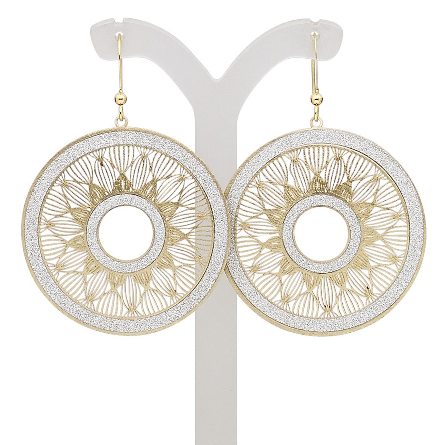 Ready-to-wear earrings feature a filigree round design with gold-finished brass and silver glitter construction. Earnuts included.