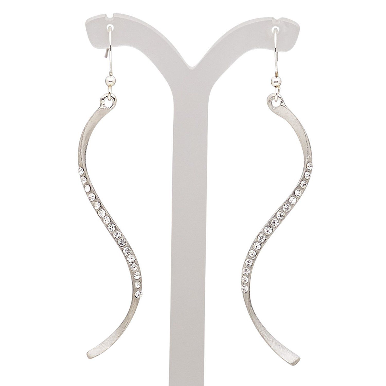 Ready-to-wear earrings feature a scratched twisted ribbon design with glass rhinestone accents. Also features imitation rhodium-plated brass and "pewter" (zinc-based alloy) construction. Earnuts included.